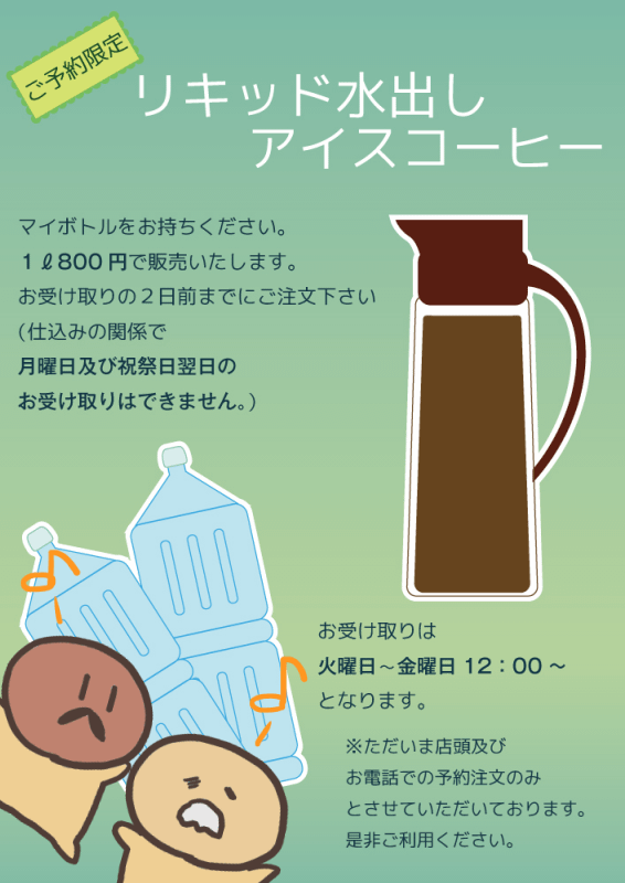 2日前までに電話をしておくだけで、本格的な水出しアイスコーヒーが自宅に持ち帰られる!素敵なサービスですね。