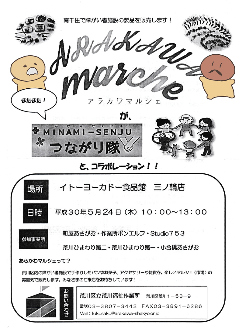 明日、5月24日(木)に開催されるアラカワマルシェにstudio753が出店致します!イトーヨーカドー食品館 三ノ輪店にて、午前10時~午後1時までお店を出していますよ。