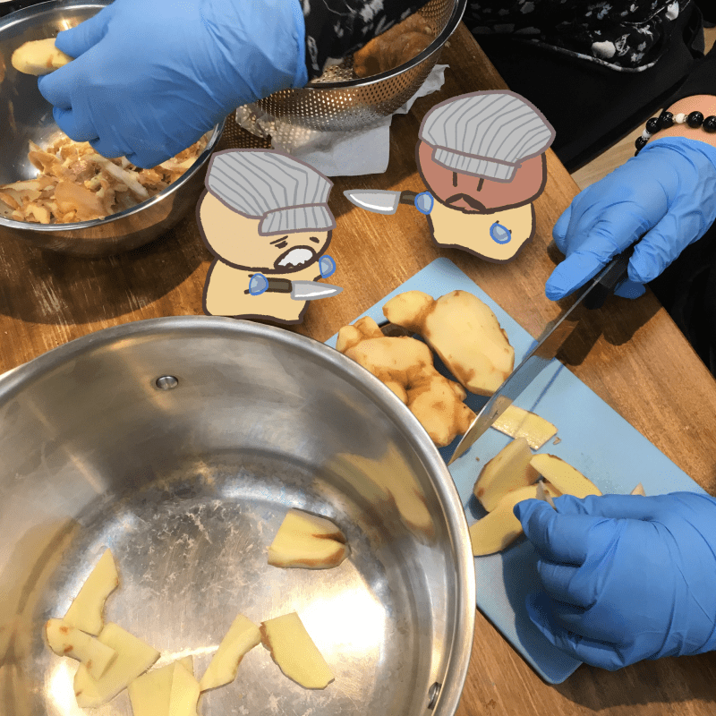 [speech_bubble type=”std” subtype=”L1″ icon=”3.jpg” name=”こひげさん”] かわを むいて、[/speech_bubble]