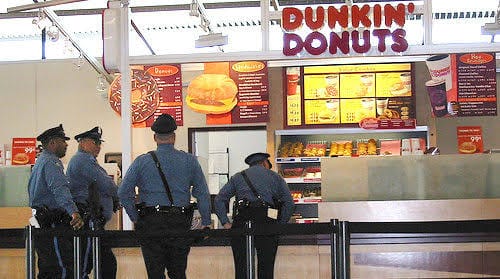 いつしか「ドーナツと警官を強く結び付ける結果」となり、毎日のように「アメリカのパトロール警官はコーヒーとダンキンドーナツ無料」とゆう都市伝説になったらしいです。