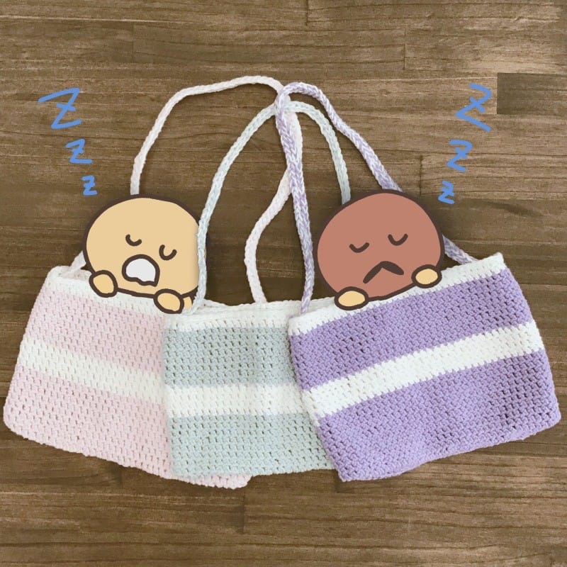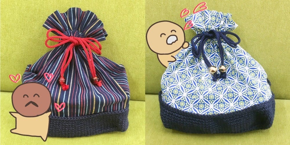 ネイビーを基調とした、レトロモダンなかごきんちゃくです!こひげさんは赤い紐のストライプ巾着がお気に入り、おひげさんは白と青の模様の巾着に夢中になっています!