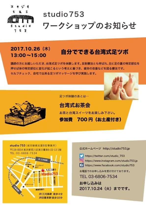 2017年 10月 自分でできる台湾式足ツボ Posted 2018-10-03 by 753studio 10月26日に行われたワークショップは「自分でできる台湾式足ツボ」でした。 Read more
