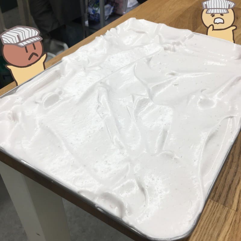 おお!これは只今試作中のマシュマロですね。冷やして固める前の状態は、雪が積もった平原のよう。