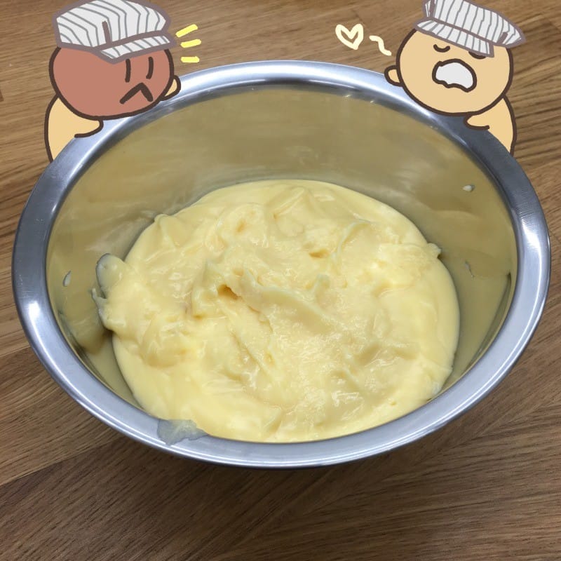 これは、カスタードクリームですよ。ほのかな甘みでとっても美味しい!これが何に使われるか、ふたりは分かるかな?