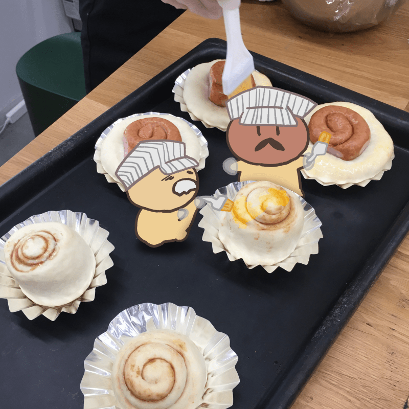 おや?ひげーずが揃ってから、初の卵黄を塗りをしているようですよ。ミニミニの刷毛を使って頑張っています!