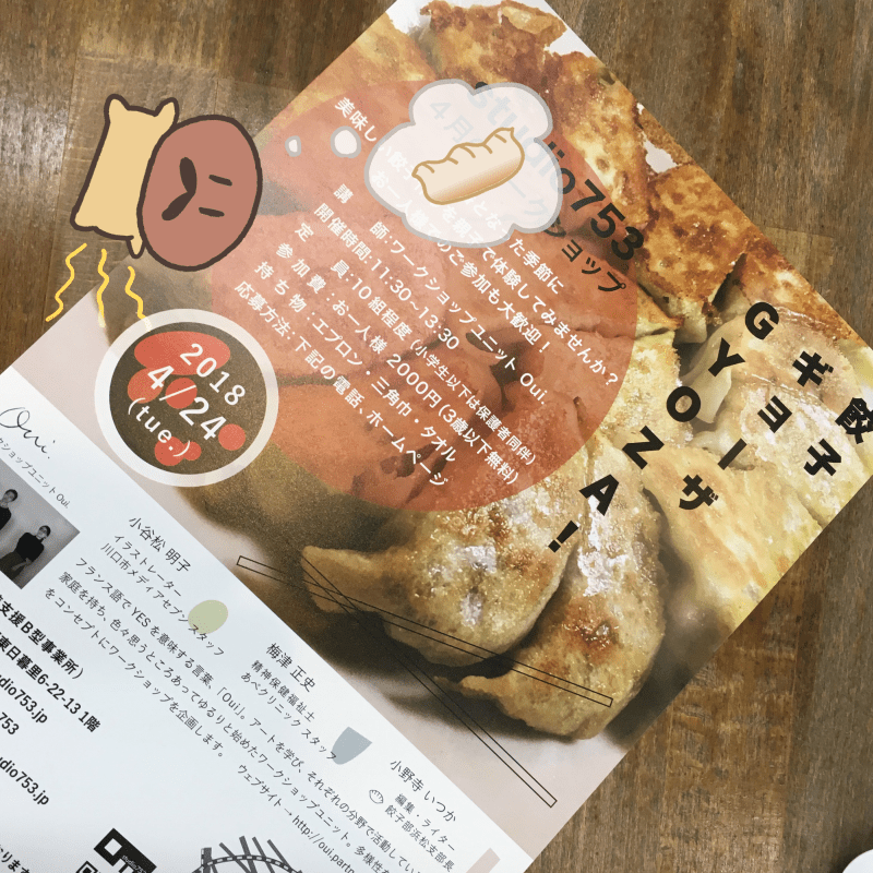 4月のワークショップのチラシができたようです、餃子のイベントとは・・・!?なんだか珍しいワークショップになりそうですね、こひげさんは餃子を食べたことはあるのかな?