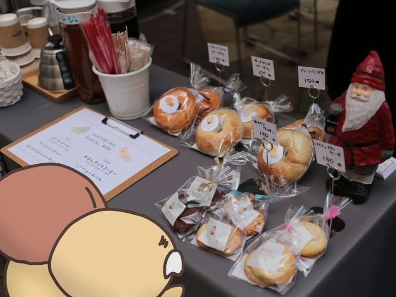 早速、販売ブースをのぞいてみましょう。机をカフェとクラフトに分けてあります。クリスマス前のイベントと言うことで、サンタの置物やリースなどが飾られています。