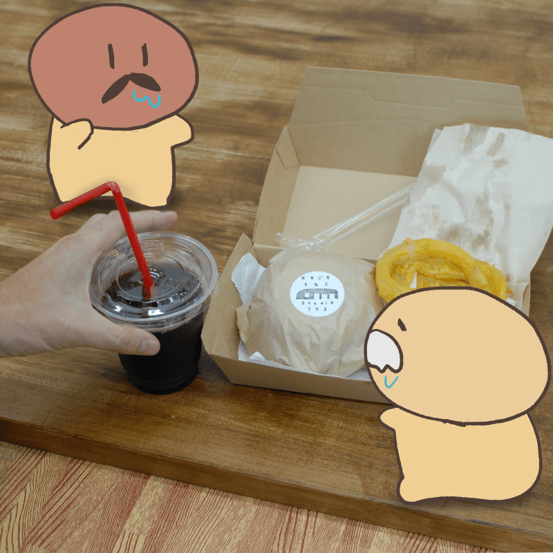 ひげーずの二人は、ランチボックスに入ったベーグルサンドとオニオンリングを狙っているようですよ。