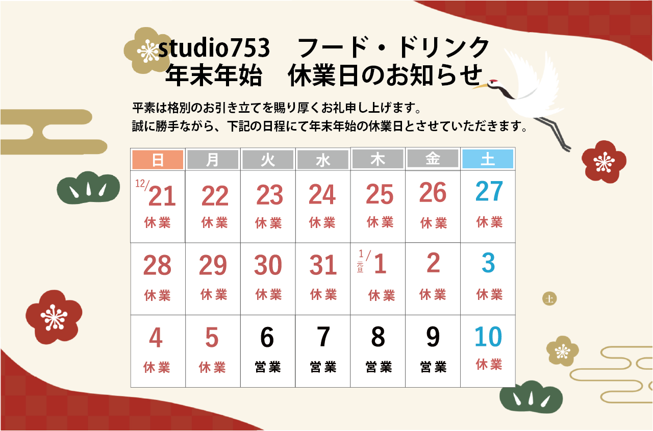 年末年始 フード・ドリンク販売のお知らせ 753studio 2025-12-01 年内の営業は12/19(金)までとなります。 12/22(月)〜1/5(月)までお休みを頂き、新年は1/6(火)から営業させて頂きます。 This entry was posted in 新着情報