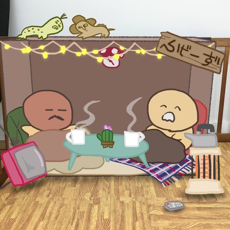 がっつり冬支度ですね!まるで寝正月をする部屋のセットのよう。でもストーブは危ないから撤去をさせてもらわなきゃ・・・。